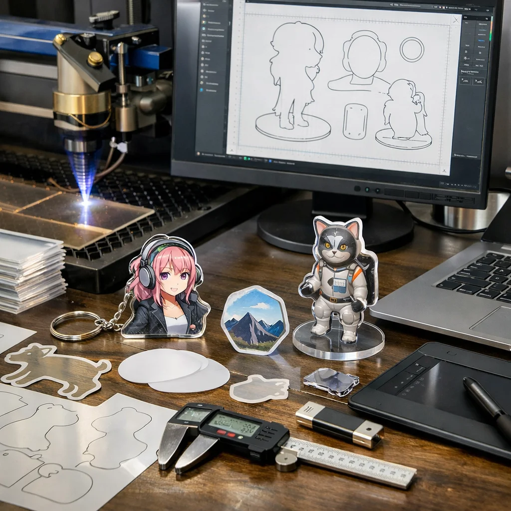このように、アクリルグッズの制作に欠かせないカットデータは、形状や加工のすべてを決定する重要な要素です。初心者でも理解しやすいように、基本的な用語やその役割をしっかりと把握し、実際の制作に活かしていきましょう。カットデータを理解することで、より魅力的なアクリルグッズの制作が可能になります。