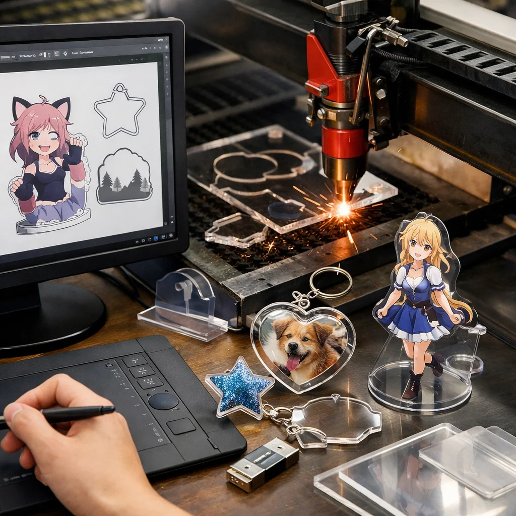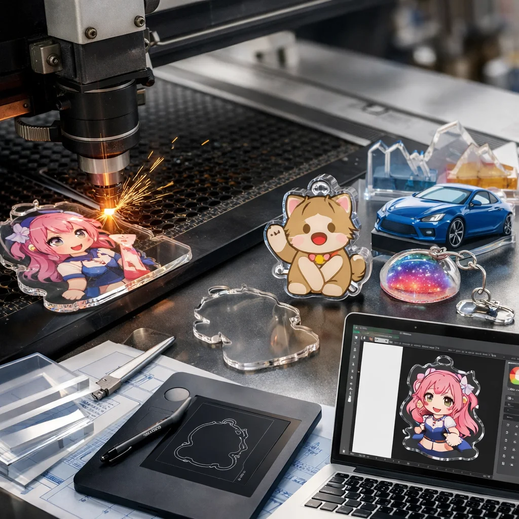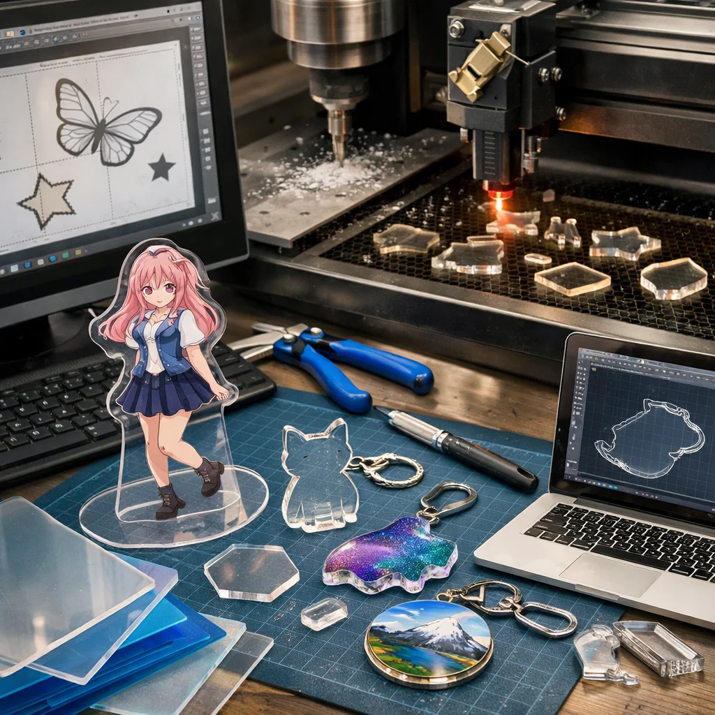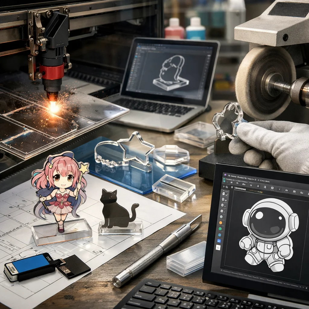 アクリルグッズの加工では、カットデータ設計が商品の多様なバリエーションを生み出し、制作・販売の両面において重要です。効率的な設計が原価削減や市場のトレンドを反映し、魅力的な製品を提供します。