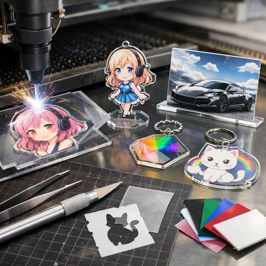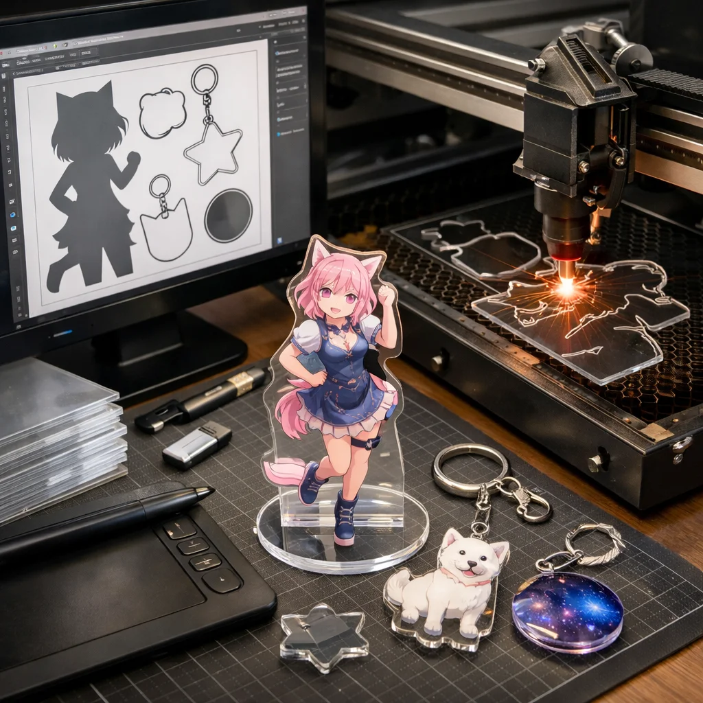 アクリルグッズは、その透明感と軽量さから、多様なデザインや機能を持つ製品が多く存在します。アクリルグッズの加工やカット、データ作成において、以下の製品が特に人気です。