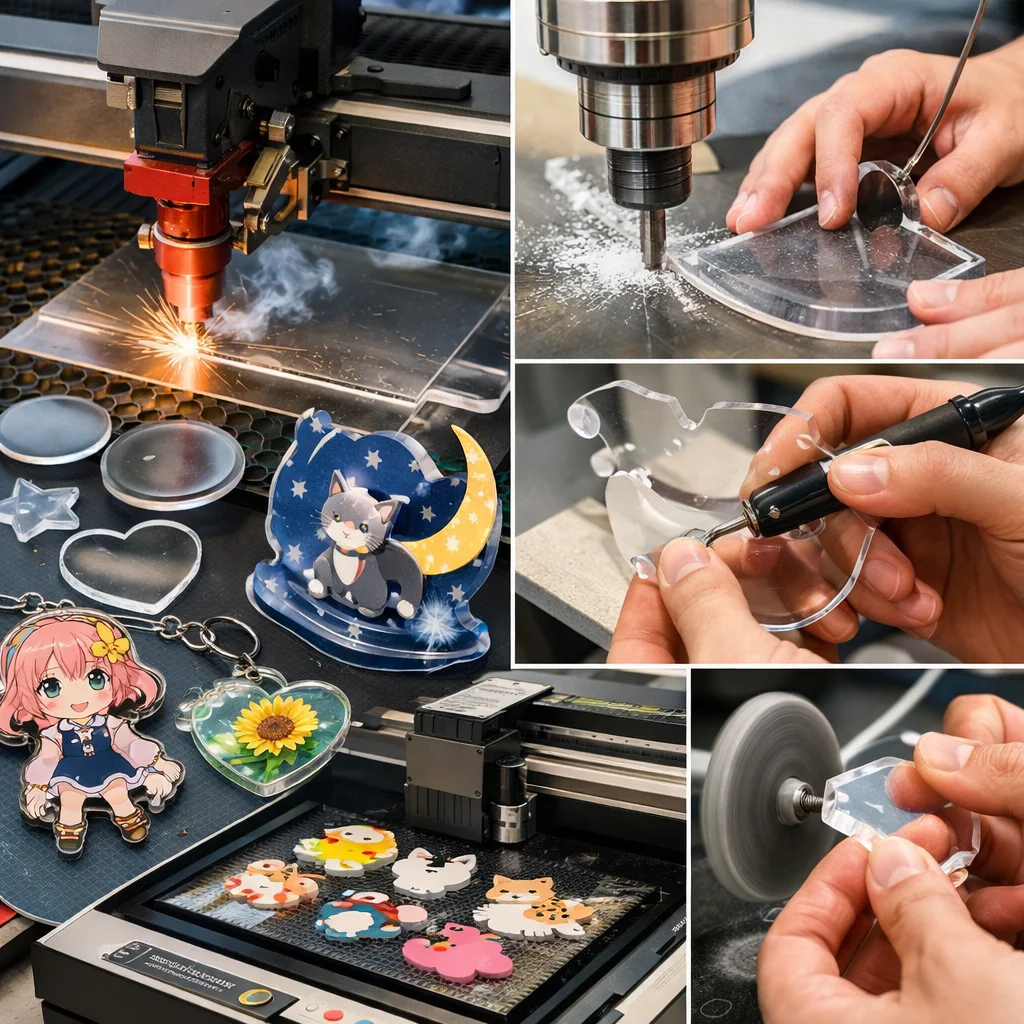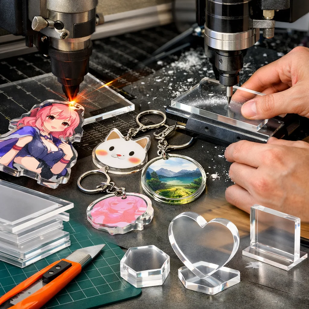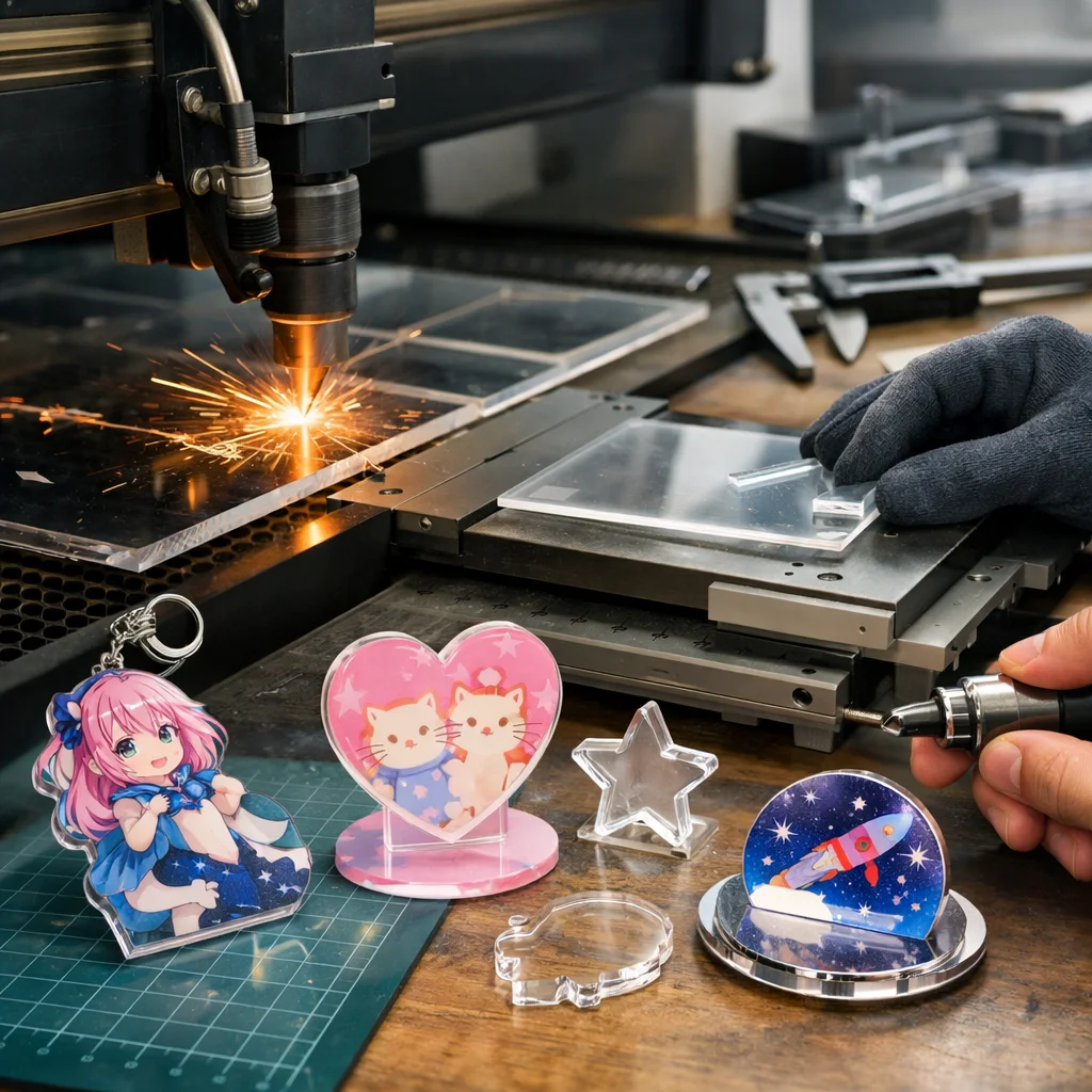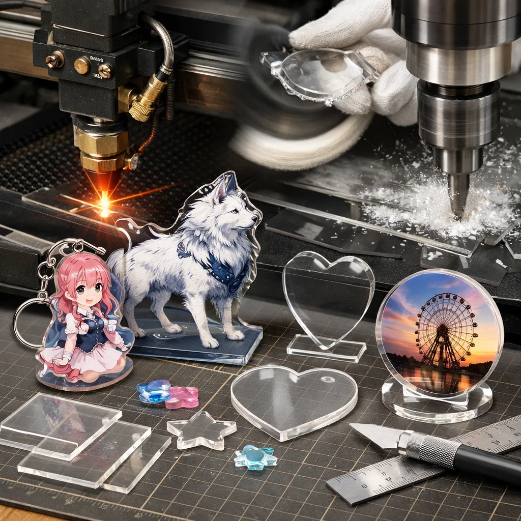 これらの特性を活かしたアクリルグッズを作る際、加工・カット方法にはいくつかのポイントがあります: