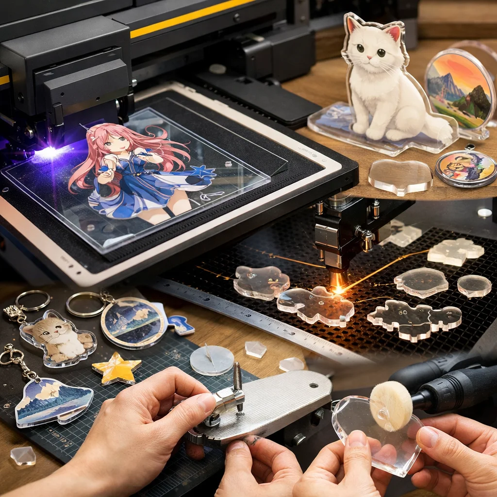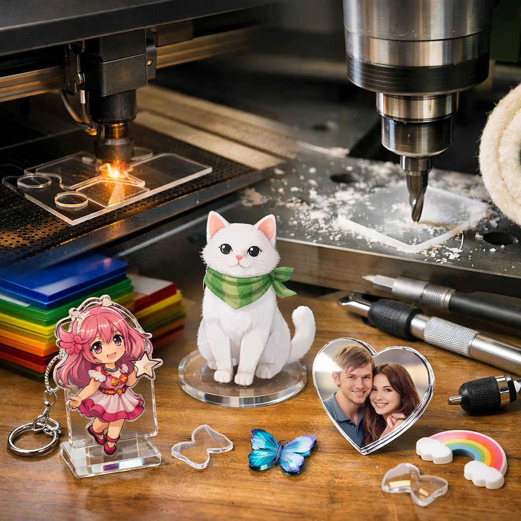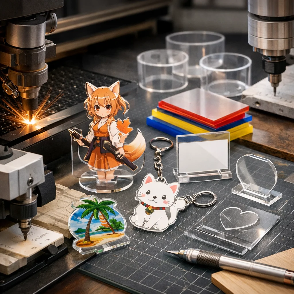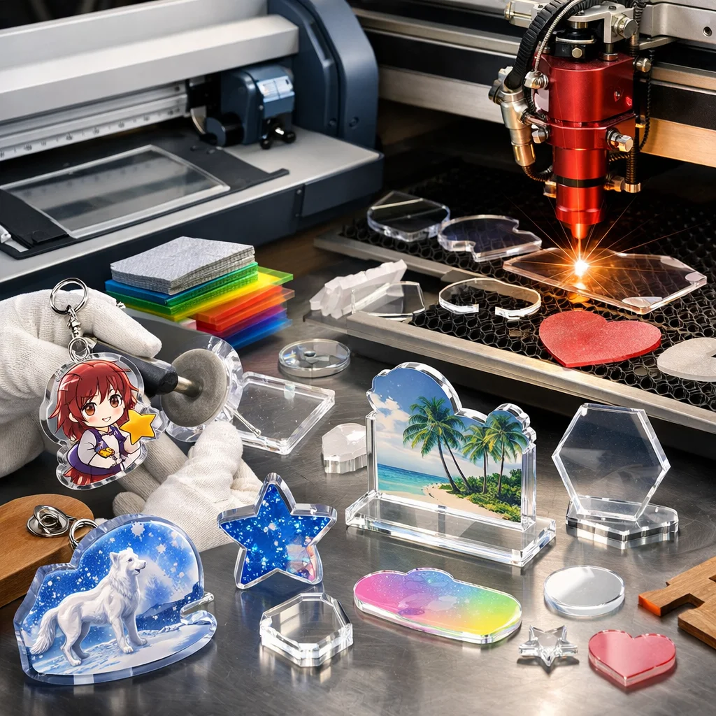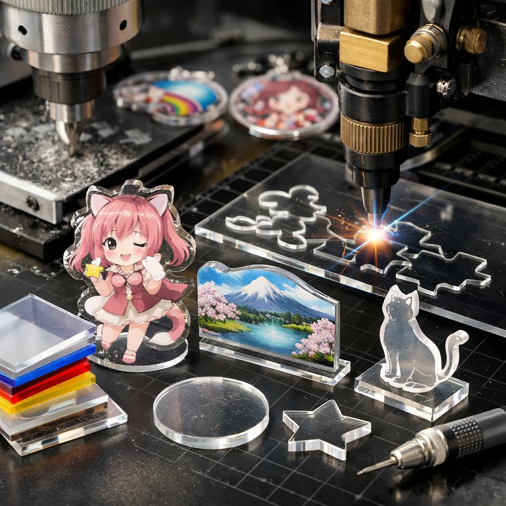アクリルグッズ加工は、アクリルを使用した様々な製品を作り出すための重要なプロセスです。この加工は、主にデザイン切断彫刻や印刷仕上げ、そして組立の5つの工程で構成されています。これらの工程を通じて、美しいアクリルグッズが誕生し、個人のDIYプロジェクトから企業のノベルティまで、幅広いニーズに応じることができます。