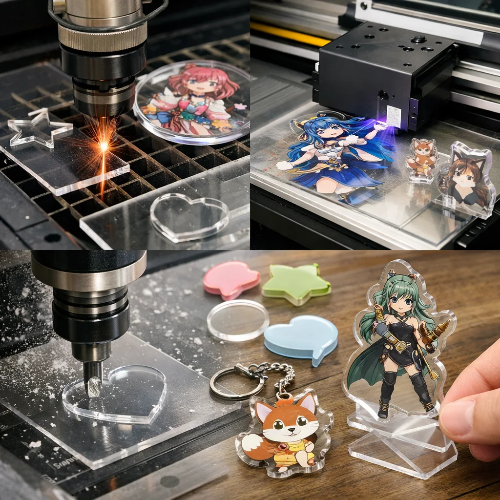 アクリルグッズは、その多様性と魅力から、特に若者を中心に人気を集めています。ここでは、キーホルダーやスタンドなどの代表的なアクリルグッズを取り上げ、その人気の理由を深掘りし、各アイテムの加工・カット方法のポイントをお伝えします。