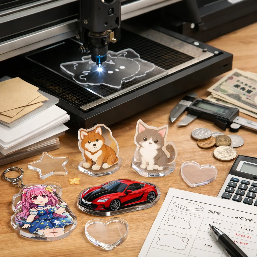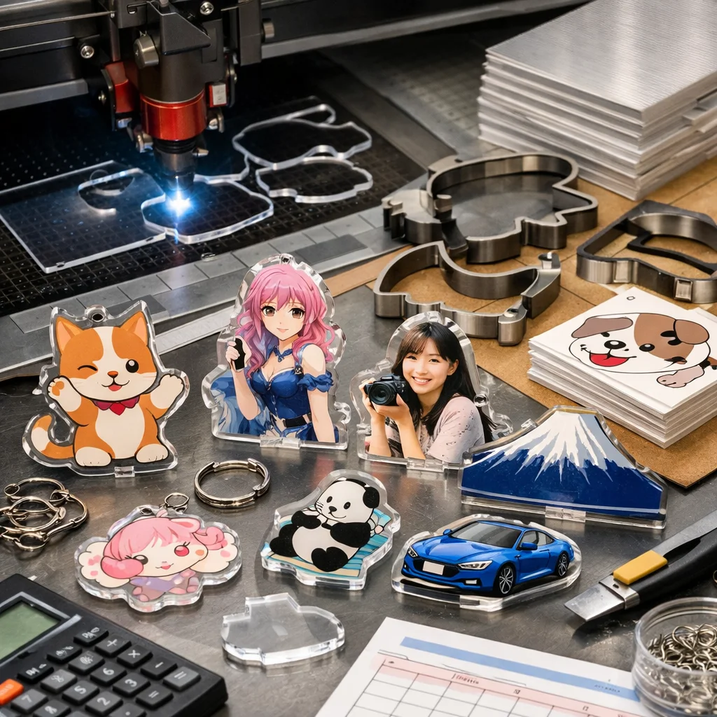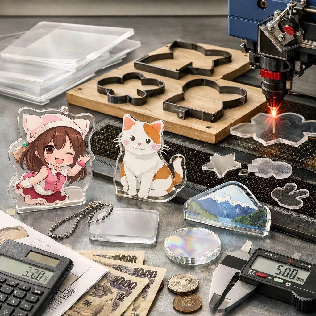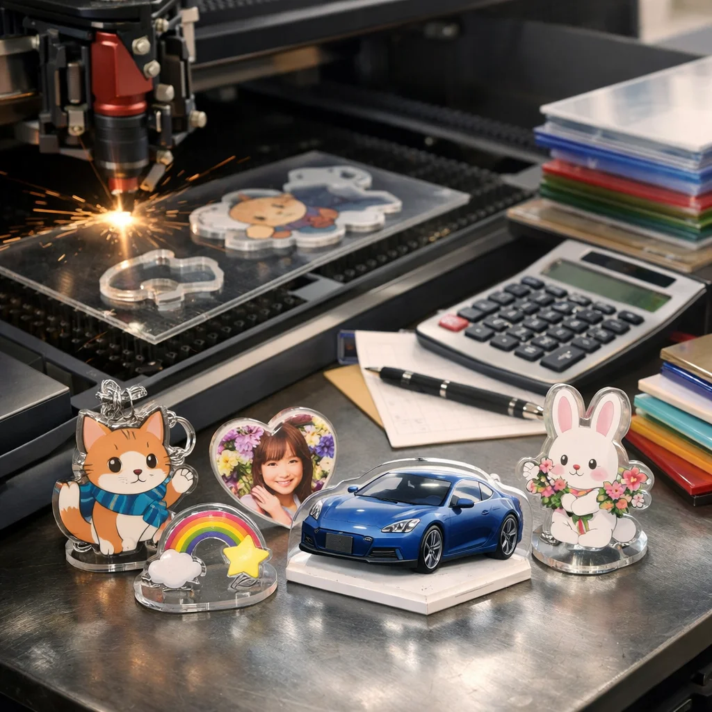 アクリルグッズの加工や型抜きの料金は、材料費、加工費、印刷費など複数の要素に分かれます。数量が増えると単価が下がるため、特に法人ノベルティなど大量発注が有利です。事前に見積もりを取ることが重要です。