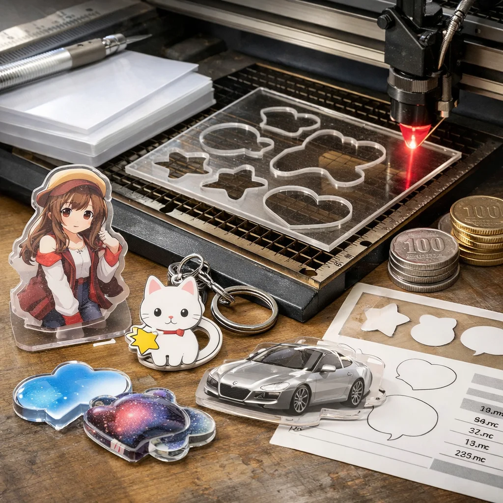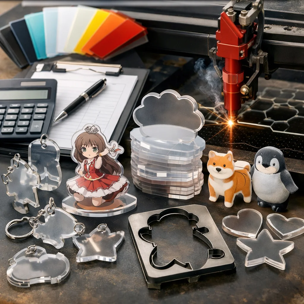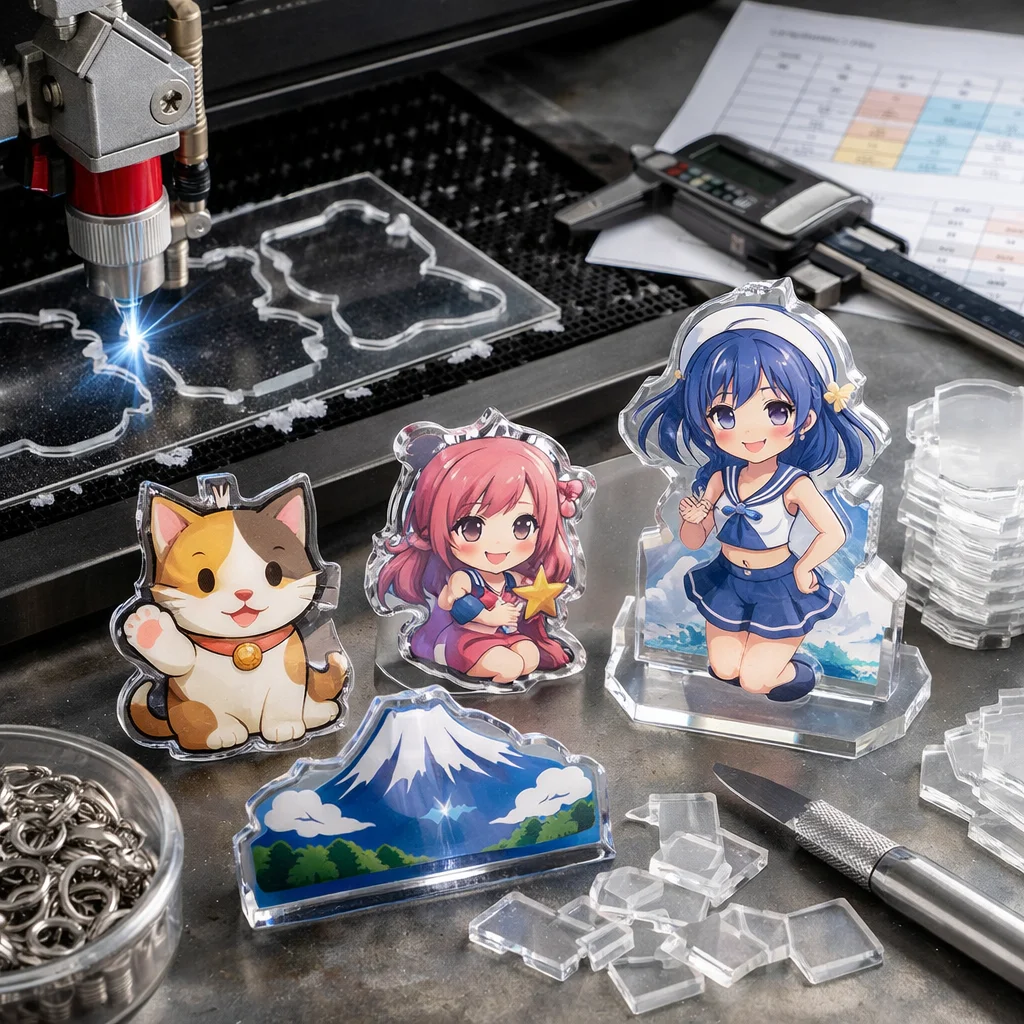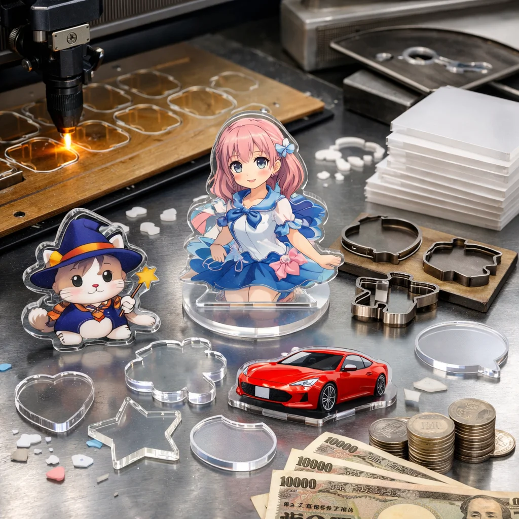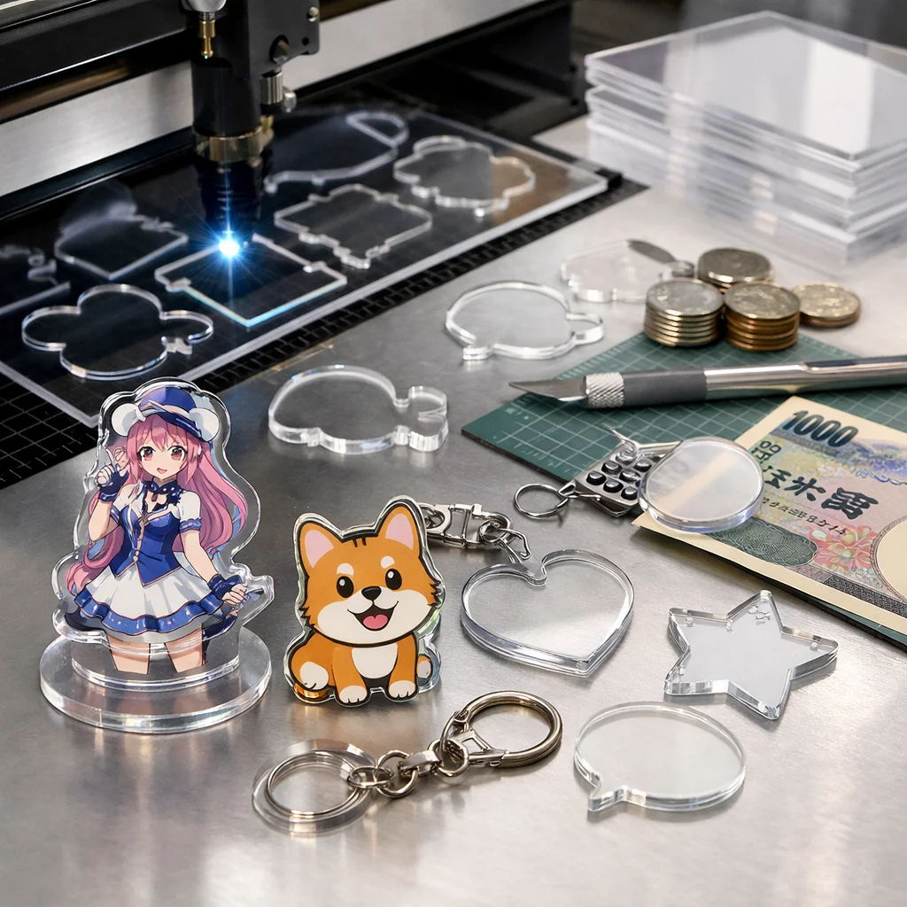 アクリルグッズの加工や型抜きの料金は、材料費、加工費、印刷費など複数の要素に分かれます。数量が増えると単価が下がるため、特に法人ノベルティなど大量発注が有利です。事前に見積もりを取ることが重要です。