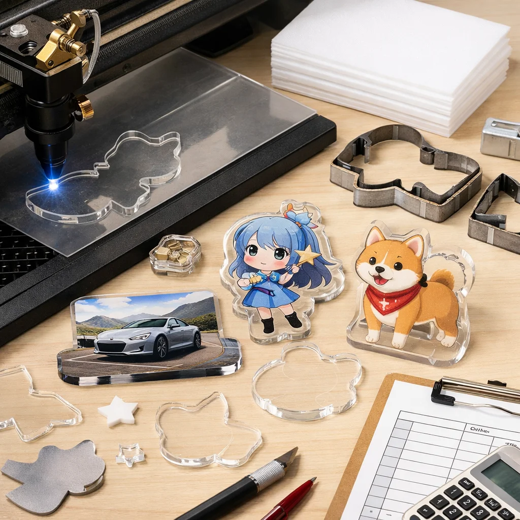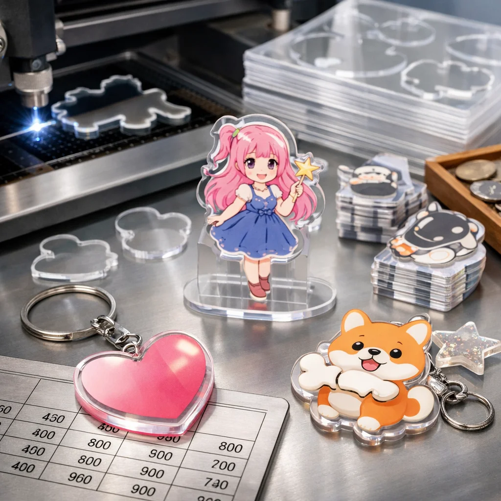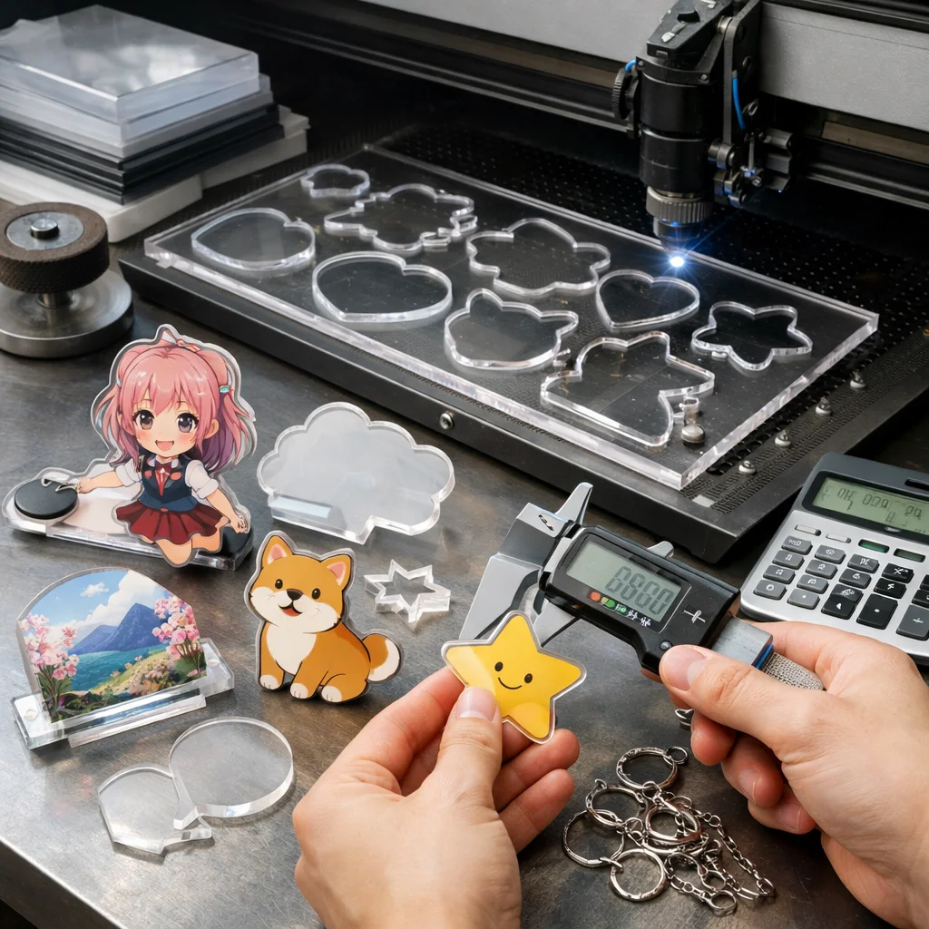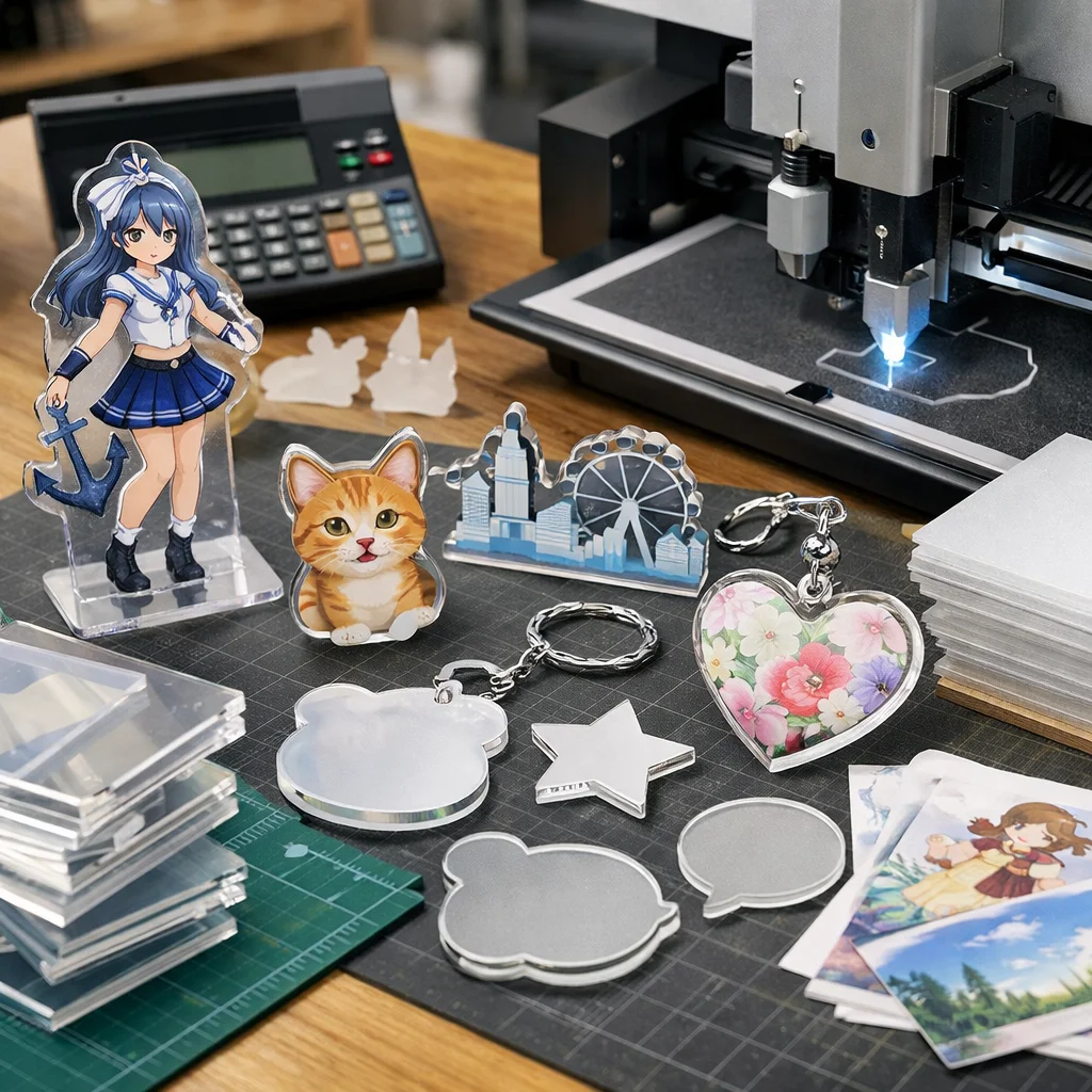 アクリルグッズの加工や型抜きの料金は、材料費、加工費、印刷費など複数の要素に分かれます。数量が増えると単価が下がるため、特に法人ノベルティなど大量発注が有利です。事前に見積もりを取ることが重要です。