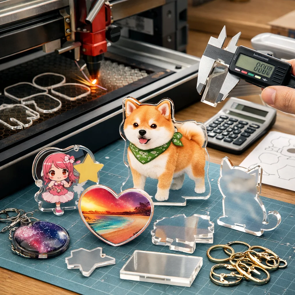 アクリルグッズの加工を行う際、料金はさまざまな要素によって変動します。その中でも特に重要な要素が、サイズ(面積/厚み)と機能(ボールチェーン穴、ナスカン、スタンド、マグネット、両面印刷、白版、グリッター封入など)です。これらの要素がどのように料金に影響を与えるのかを理解することは、より良いアクリルグッズを制作するための第一歩となります。